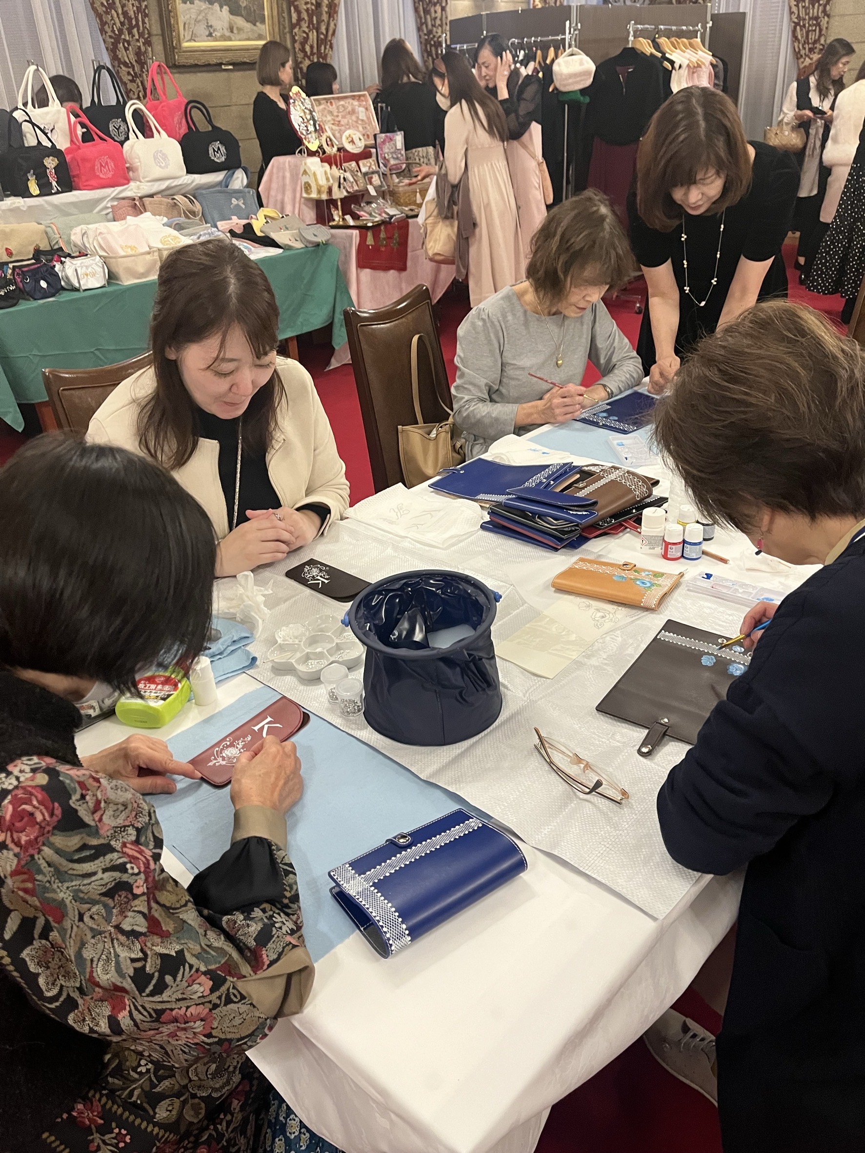 本革の手帳カバーやメガネケースにレース模様と花を描くレザーペイント体験を実施し、