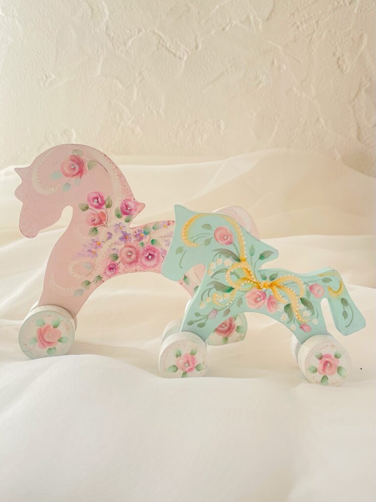 手描きのバラがそっと寄り添う、小さな木製の馬たちです。
